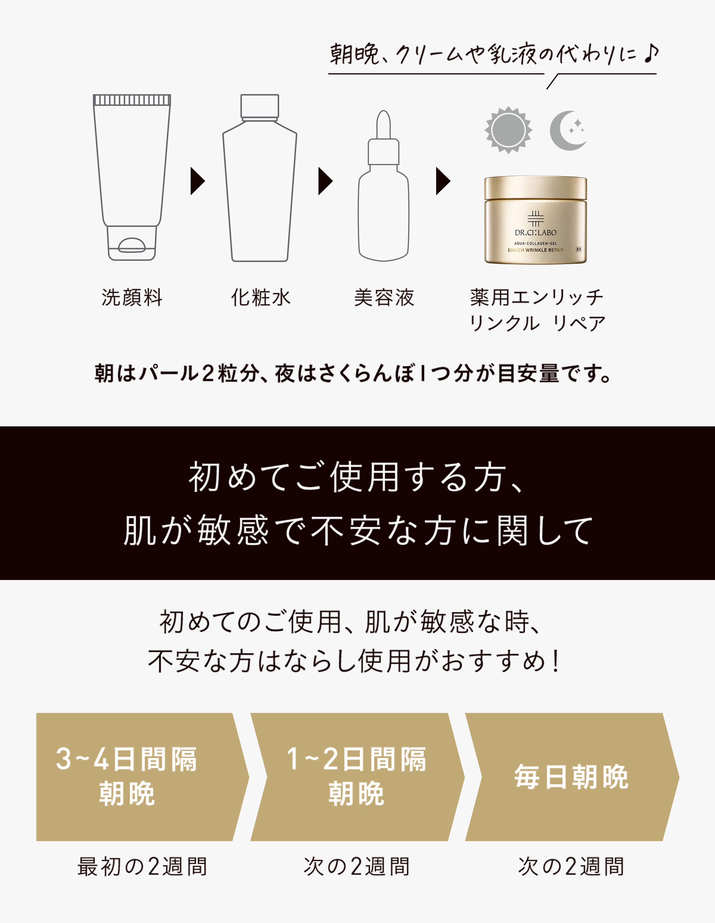 化粧水、美容液の後、クリームや乳液の代わりのタイミング。
