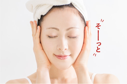 化粧水を規定量の半分手元にとる。1回目同様手のひらになじませ、両手で顔を包み込むように塗り、細かい部分は指で重ねる。
