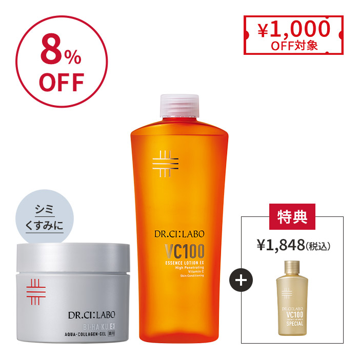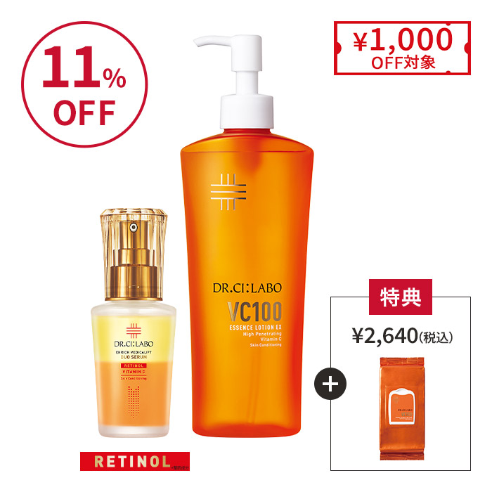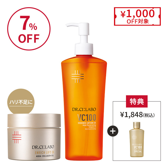 3,998円お得:VCローションスペシャル150mL(税込8,415円)のmL単価を基準に285mLの税込価格と比較した差額より算出 最高濃度:VC100ライン内 エイジングケア:年齢に応じたお手入れ