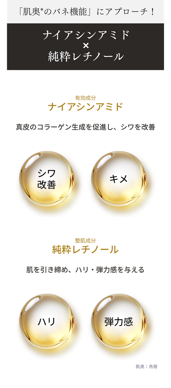 ハリ・弾力感を生みだす「肌奥のバネ機能」のメカニズムに着目し、エイジングケアケアに向けた2大成分 「ナイアシンアミド」×「純粋レチノール」配合のハリ・シワ改善ゲル。角層までピンっと、弾むようなハリ肌へ。