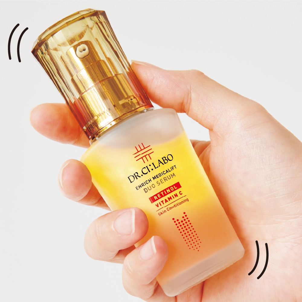 高浸透ビタミンCとレチノールが配合された2層式美容液を使用前にシェイク! 調合するような感覚で作りたての美容液を肌に届けます。