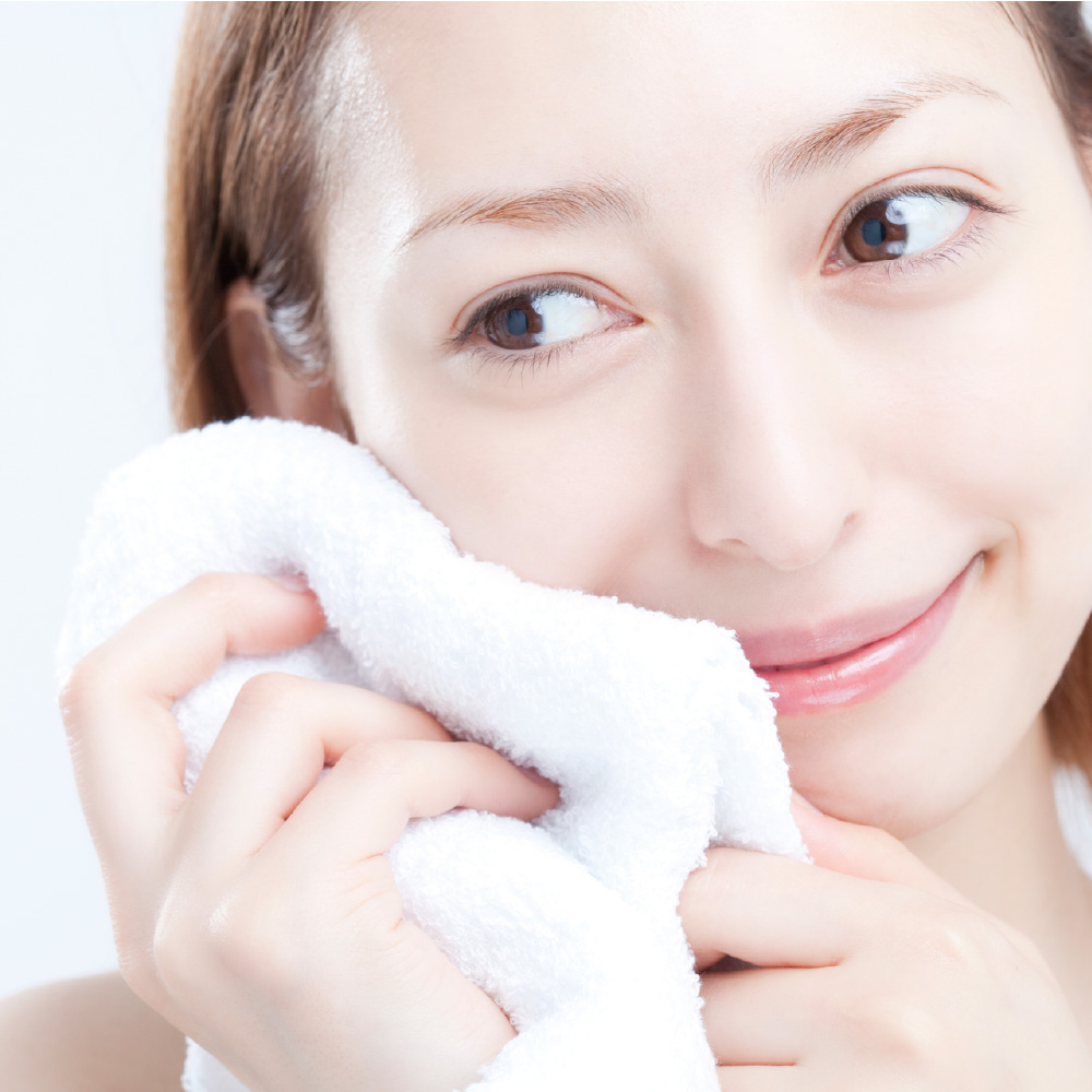吸水性に優れたふんわりしたタオルをやさしく押し当てて。ゴシゴシこすると肌荒れの原因になるのでNG!