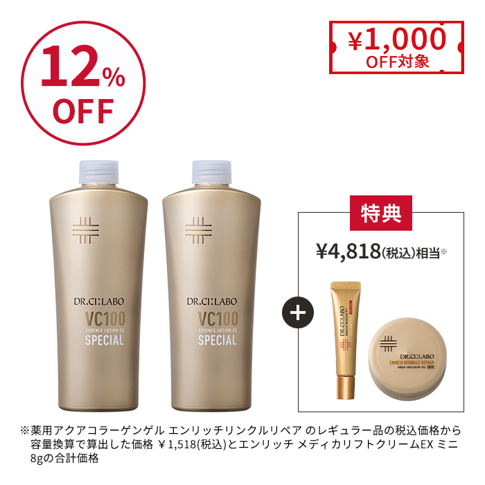 VC100エッセンスローションEXスペシャル ポンプタイプ 285mL + VC100エッセンスローションEXスペシャル レフィル 285mL + 薬用アクアコラーゲンゲル エンリッチリンクルリペア ミニ 10g + エンリッチ メディカリフトクリームEX ミニ 8g が1つのセットに! [数量限定 80 セット 無くなり次第終了]