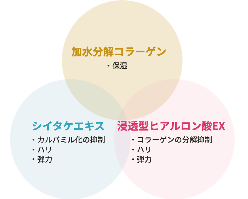 加水分解コラーゲン:整肌成分 シイタケエキス:整肌成分 浸透型ヒアルロン酸EX:アセチルヒアルロン酸Na(保湿成分)